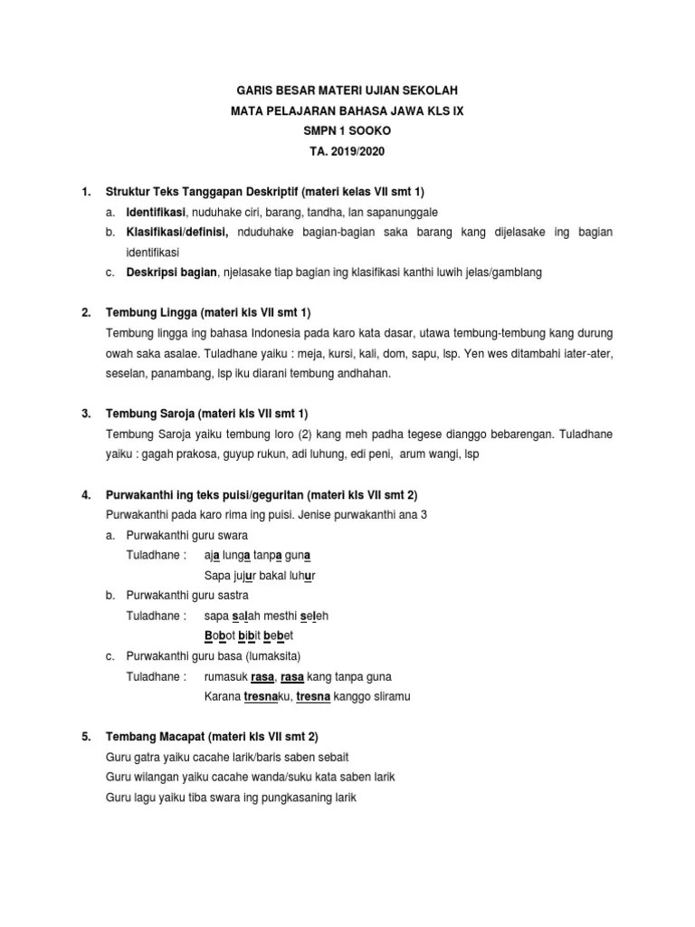 Babak belur tegese bonyok lukane serius. Ing tlatah malang kaloka papan wisata sing edi peni. Lara lapa kalebu tembung saroja. Contoh iklan bahasa jawa : Negeri padhangklana iku rakyate ayem tentem alame .